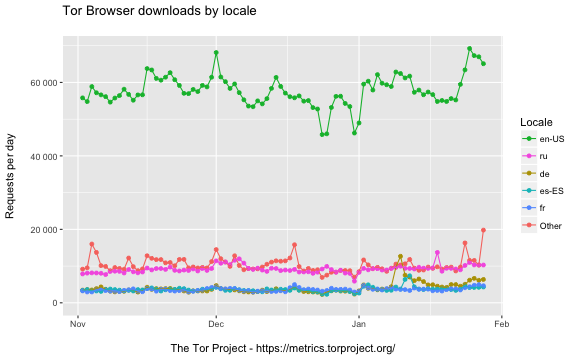 Hi Isabela, On 29/01/17 17:59, isabela wrote: > On 1/29/17 11:19, Karsten Loesing wrote: >> Maybe have a look >> at the .csv file and data format to decide whether that works for you, too: >> >> https://metrics.torproject.org/stats/webstats.csv > > quick question! I see we keep locale information for the downloads in > the csv file, would be possible - maybe in a future iteration - to > filter it by locale? Would be great to know the top languages etc. This is possible. Though we'll have to add a separate tab to the page, like "Tor Browser downloads by locale". One more probably doesn't hurt, but we should be careful with that thinking, or we'll make the interface harder to use for everyone. What do you think about the attached graph? All the best, Karsten