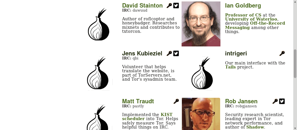 I also think the monochrome might look better, and I think it would help if the key and twitter icons were also monochrome to match.Hmmm. Gave it a try but honestly not sure monochome onions looks better... https://www.atagar.com/transfer/tmp/people_page-monochrome_onion.png If folks want this though that's fine.I think the monochrome looks better. With or without the monochrome, can we try: - resizing the onion smaller, more white space - removing the rounded corners on the pics I did a quick test of the above in the attached image. -Steph -- Stephanie Whited Communications Director The Tor Project |