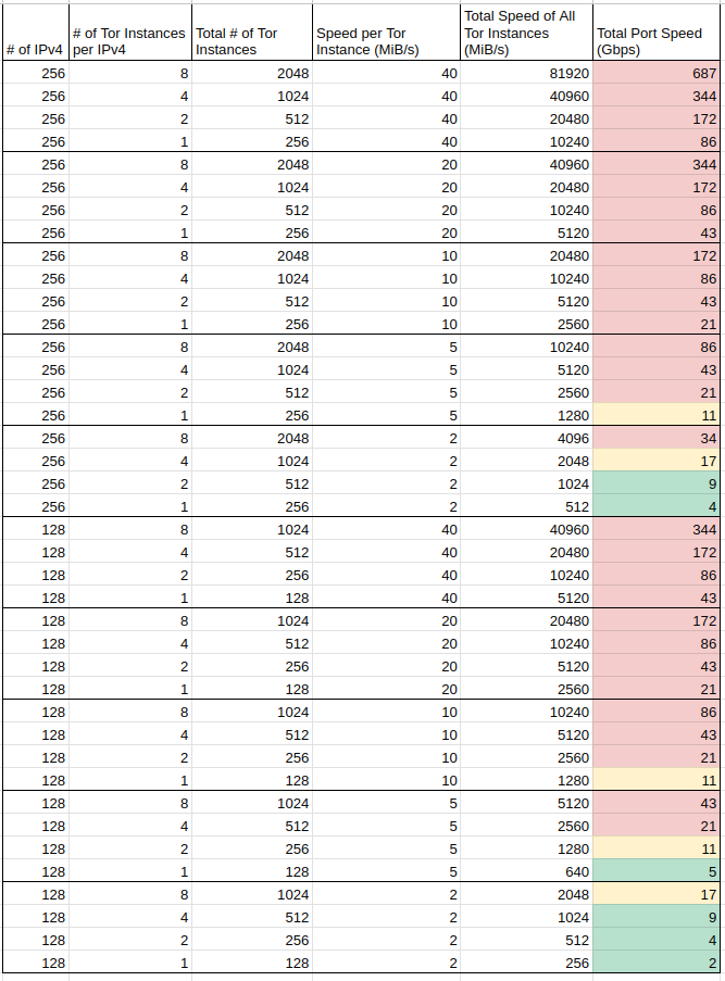 Here's a rough sizing table (attached and inline) of Port Speed in Gbps needed depending on # of available IPs, # of Tor instances per IPv4 and Speed per Tor (MiB/s).