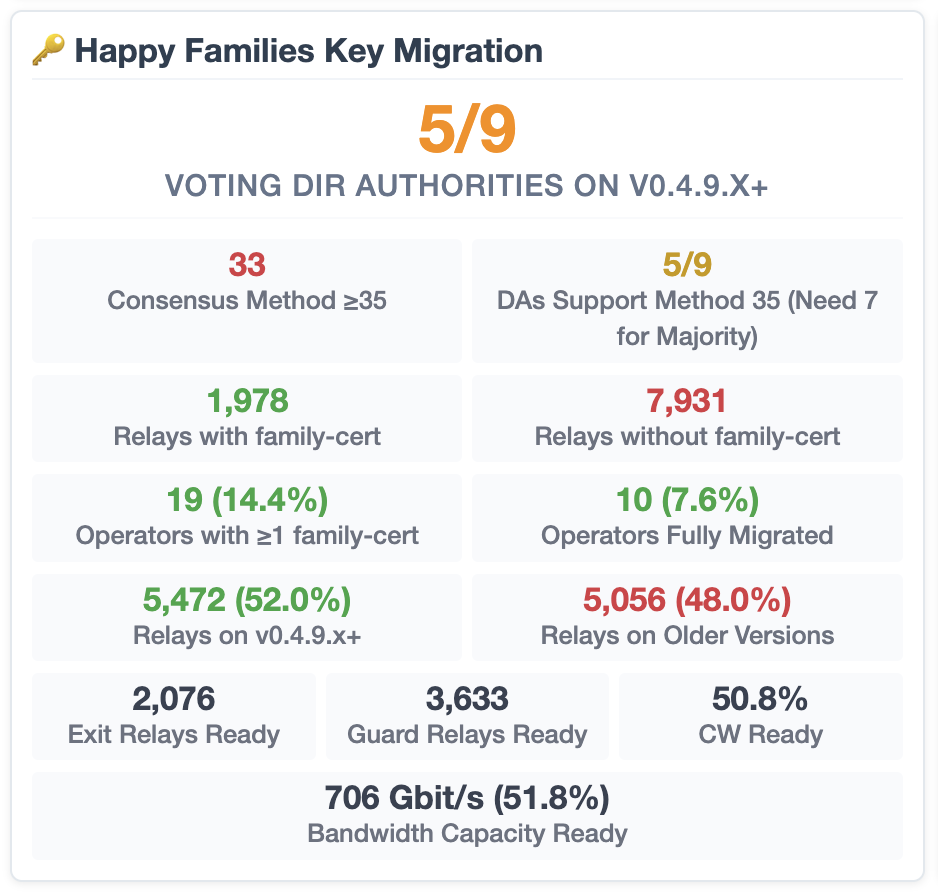 To help answer “what still needs to happen before the network can rely on Happy Families (and eventually stop depending on MyFamily)?”, we put together a small public dashboard that tracks the main rollout gates: https://metrics.1aeo.com/network-health.html#happy-families High-level flow: 1) Voting directory authorities upgrade (v0.4.9.x+) DAs need to be on v0.4.9.x+ so the network can move forward with the newer directory protocol pieces. 2) Consensus method moves to 35 Once a >2/3 voting DA majority supports method 35 (7/9), the consensus can adopt it. 3) Relays publish Happy Families material Relay families configure FamilyId so relays publish family-cert, which lets directory documents/micro descriptors carry the happy families identifier information. 4) Clients upgrade and use it As Tor clients (Tor Browser, tor, etc.) widely consume happy families identifiers, then deprecating MyFamily becomes possible. The dashboard shows live counts for DA readiness (v0.4.9.x+ and method-35 support), current consensus method, relay publication (family-cert), and a few “how much of the network is ready” slices (guards/exits/CW/bandwidth). References: - Relay operator guide (FamilyId / Happy Families setup): https://community.torproject.org/relay/setup/post-install/family-ids/ - Proposal 321: https://spec.torproject.org/proposals/321-happy-families.html Feedback welcome—especially if there are other readiness signals you’d like to track, or if you spot anything that looks off for your relays. On Tuesday, February 3rd, 2026 at 5:00 AM, Alexander Hansen Færøy via tor-relays <tor-relays@xxxxxxxxxxxxxxxxxxxx> wrote: > On 02/02/2026 22.36, tor_appliedprivacy.net via tor-relays wrote: > > Today we enabled the happy family setup across all our relays. > > > > Since all our relays run in a single /24 we also removed MyFamily at the > > same time. This should help reduce the overhead introduced by MyFamily. > > This is not what any of us on the Network Team are recommending right now, but > if others think this is a good idea despite that: please ensure that your IPv6 > addresses, at the very least, are also within the same /32 in addition to the > /16 requirement for IPv4. I am almost certain that is always the case, but > please just be sure before you proceed. > > We are very interested in hearing feedback on the 0.4.9.4-rc release candidate > and in resolving any issues before we stabilize 0.4.9. Maybe the above approach > will reveal some issues :-) > > Cheers, > Alex > > -- > Alexander Hansen Færøy > _______________________________________________ > tor-relays mailing list -- tor-relays@xxxxxxxxxxxxxxxxxxxx > To unsubscribe send an email to tor-relays-leave@xxxxxxxxxxxxxxxxxxxx >